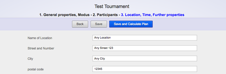 You can find the name of your tournament on top. If you accidentally misspelled or want to change the name of your tournament you can do so here as often as you like, even if the schedule is already set. Just click the Back button on top of each page until you're back here and edit the content of this box.